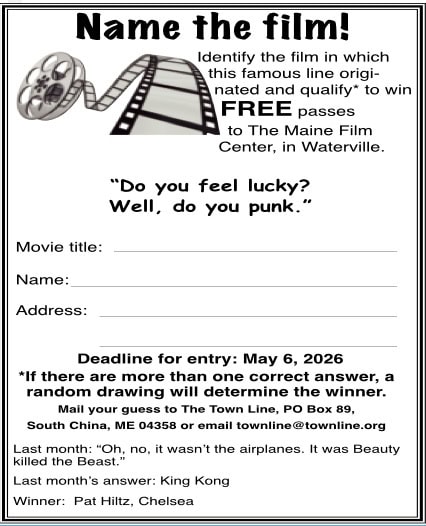 Identify the film in which this famous line originated and qualify to win FREE passes to The Maine Film Center, in Waterville: “Do you feel lucky? Well, do you punk.” Email us at townline@townline.org with subject “Name that film!” Deadline for submission is May 6, 2026.
