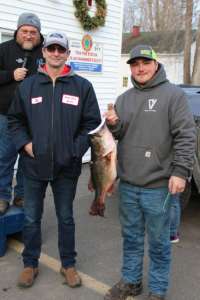 Left to right, China Four Seasons Club President Tom Rumpf, sponsor Deisel Dan and Trevor Yorke, winner of the Lunker of the Day prize. (photo by Cindy Senkbeil)