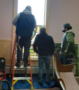 The stained glass window named in honor of Louis Metcalf Kitchin was removed on March 23 by workers from Vintage Glass Works and will be reinstalled later this spring. (contributed photo)