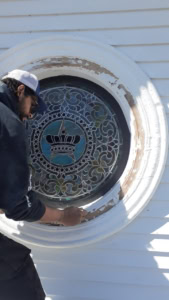 A worker from Vintage Glass Works, of Gardiner, repairing the “Rose Window” at the Vassalboro United Methodist Church earlier this month. (contributed photo)
