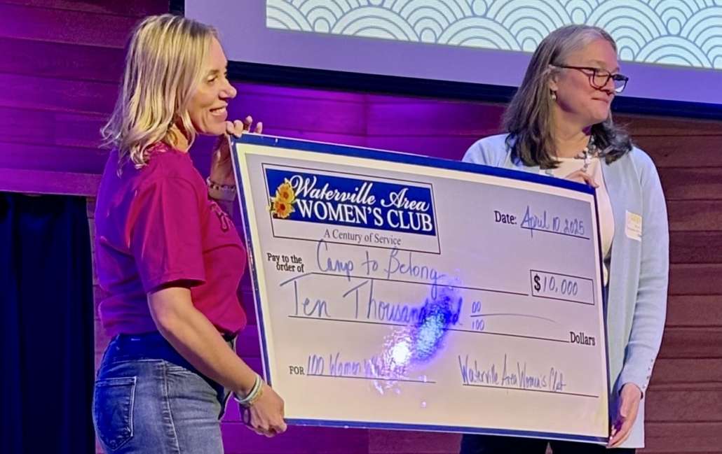 Adrian Phair, board member of Camp to Belong, accepts the $10,000 check last year at Waterville Area Women’s Club “100 Women Who Give” event. This year’s nonprofit organizations on the voting ballot include Hardy Girls, Hospice Volunteers of Waterville Area, and Sexual Assault Crisis & Support Center. To purchase a ticket, visit watervilleareawomensclub.org. (contributed photo)
