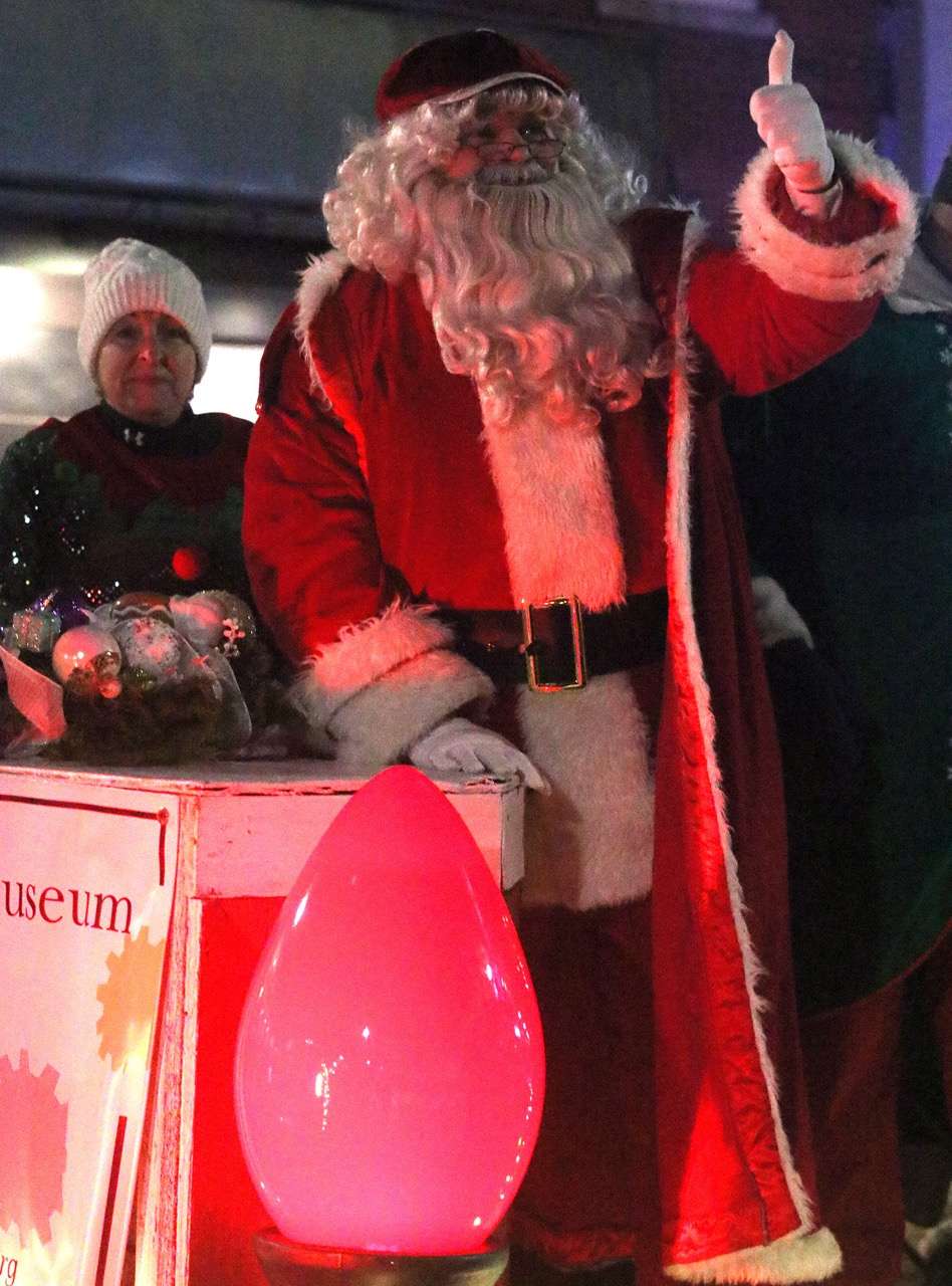 Santa Claus waves to the crowd as he approaches his seasonal home in Kringleville, at Castonguay Square, in Waterville. (photo by Mark Huard, Central Maine Photography)
