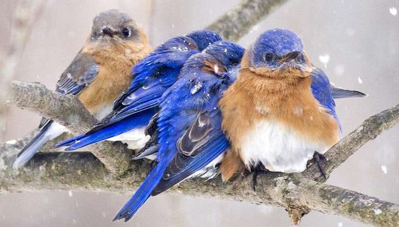 These eastern bluebirds huddle in an attempt to stay warm. (photo courtesy of Massachusetts Audubon Society)
