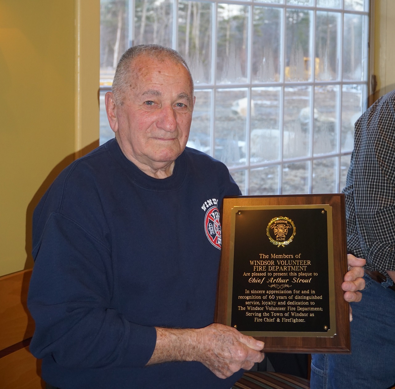 Windsor Fire Chief Arthur Strout, 79, receiving a recognition award for 60 years of service in April 2019. (photo by Eric Austin)