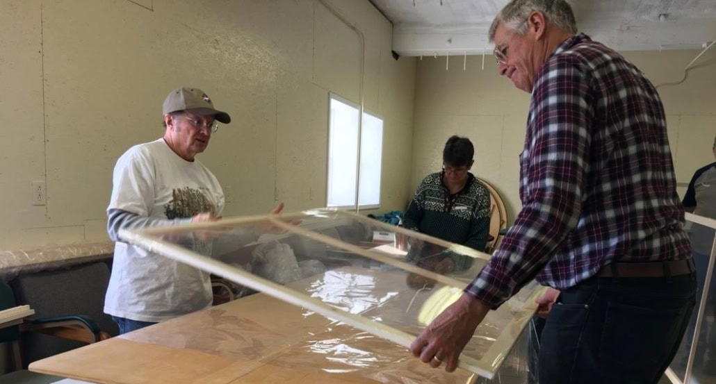 Volunteers prepare window inserts at a previous WindowDressers workshop, in Vassalboro. (photo courtesy of Vassalboro Historical Society)