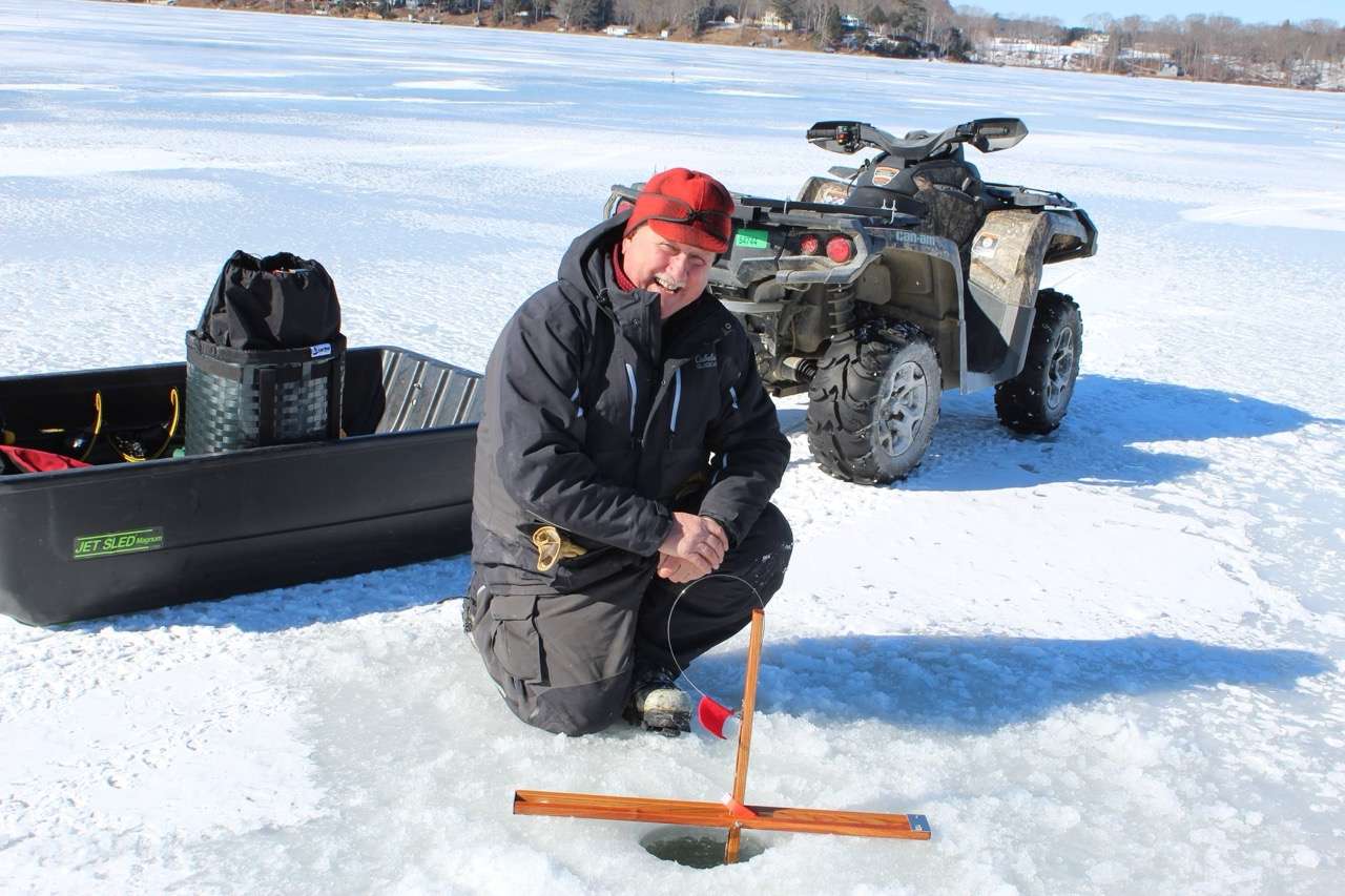 Local angler enjoys setting up ice fishing traps at the China Lake Ice Fishing Derby. This year’s derby will be held on February 16 on China Lake benefiting the China Four Seasons Club and the China Village Fire Department. (photo courtesy of Sandy Isaac)