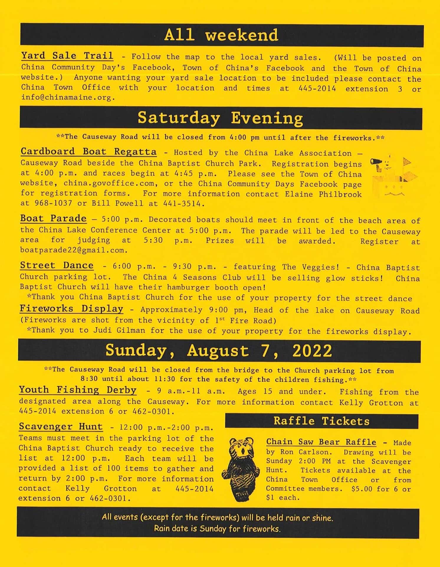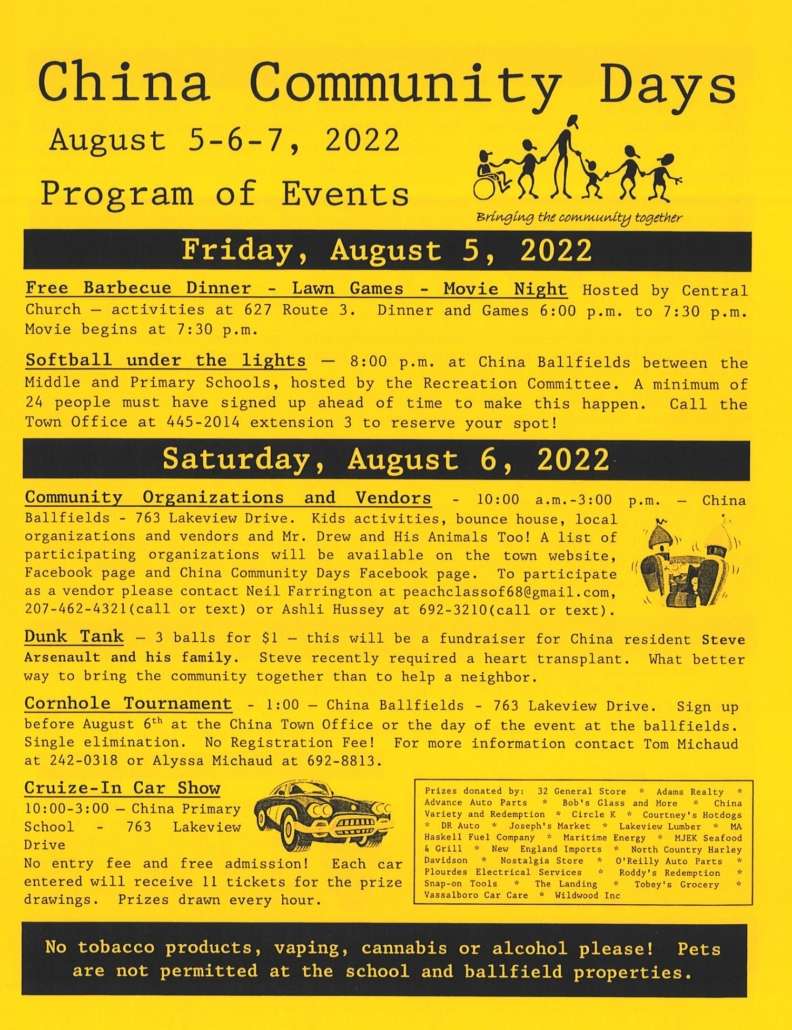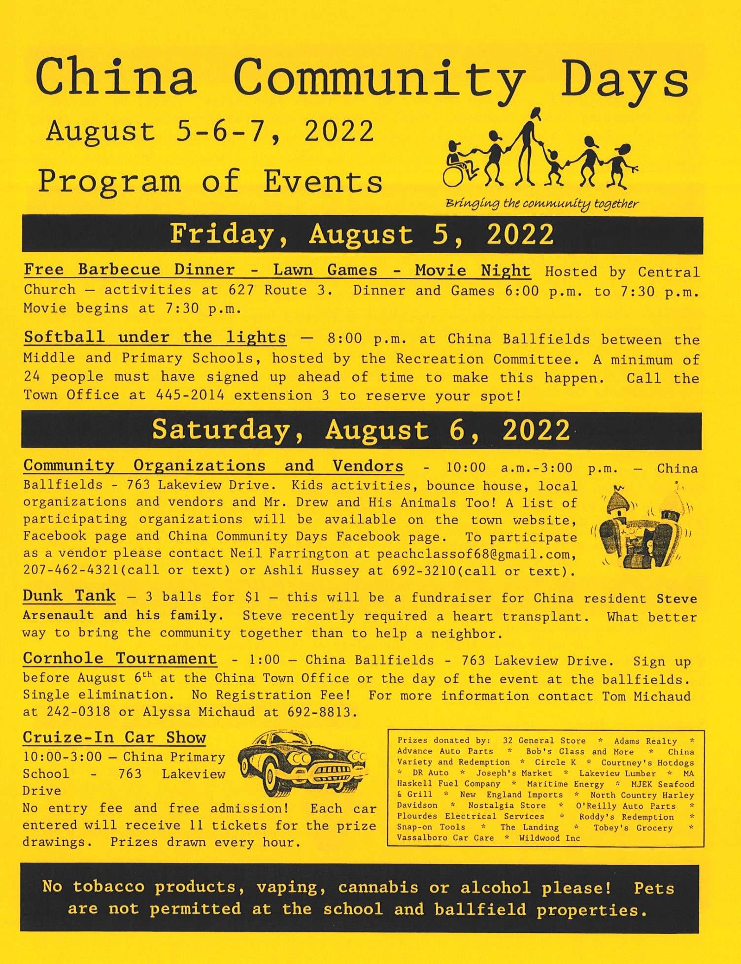EVENTS: China Community Days schedule of events Friday, August 5 – Sunday, August 7