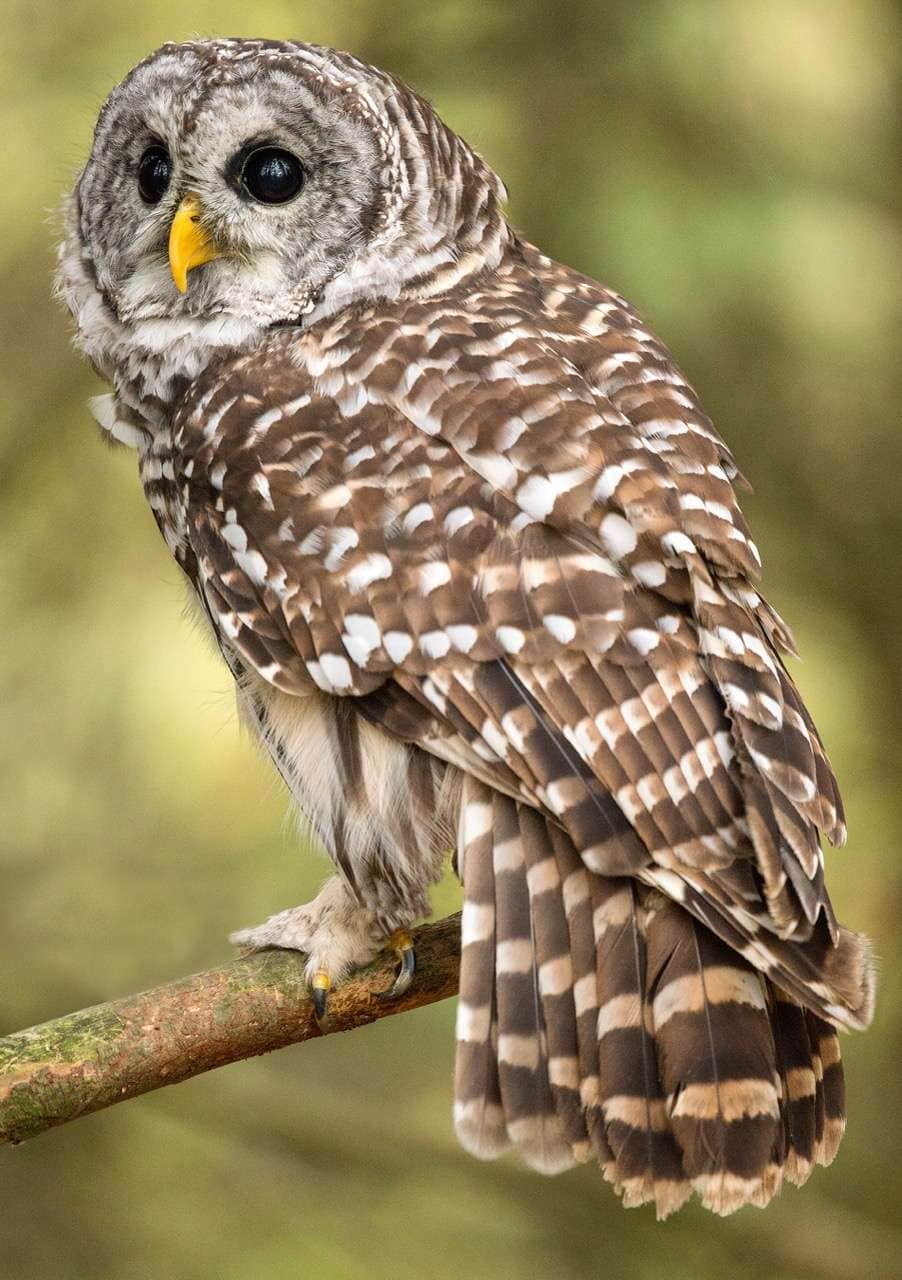 An adult Barred Owl can be anywhere from 16 – 25 inches long and weigh 1.1 to 2.3 pounds, with a wingspan of 38-49 inches. The Barred Owl is the only true owl of the eastern United States which has brown eyes. All others have yellow eyes.