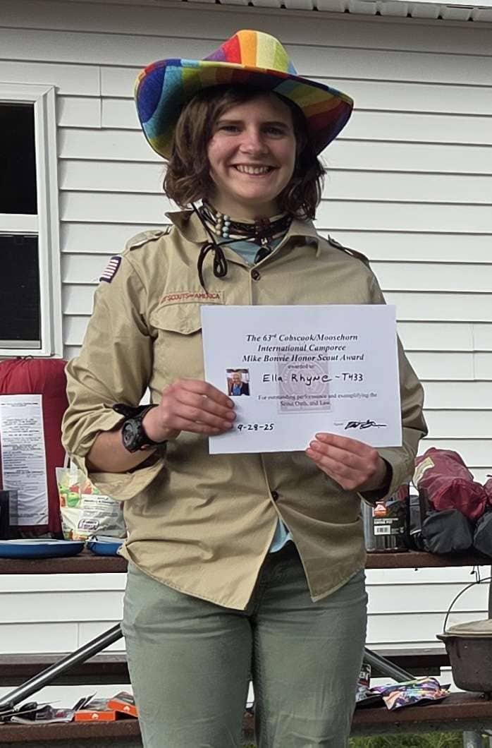 The first recipient of the 2026 District Award of Merit was Jamie Santiago, of Troop #410, Vassalboro. Jamie joined Scouting in 2019 when her son joined Pack #61, in Norton, Massachusetts, which is part of Narragansett Council. In 2020, Jamie and her husband Christopher moved to Vassalboro. They joined Pack #410, Vassalboro, along with their son. Jamie has held multiple positions of responsibility in her pack, and when her son crossed over into Troop #410 she also volunteered in various leadership roles to help keep the unit running smoothly.