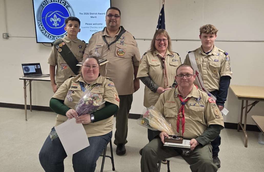 The peak of the evening was the awarding of the District Award of Merit. The District Award of Merit is the highest distinction and recognition that can be given to any adult leader within the district. The nomination process is completed through an application with at least two letters of recommendation from one’s peers. The nomination committee reviews the submissions and may select only two recipients for the award year. This year the committee selected two dedicated individuals whose records show they consistently go above and beyond the call of duty as volunteers in Scouting America.